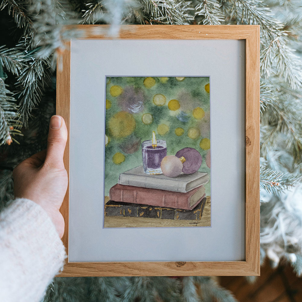 Celebrate the magic of cozy reading season with this charming watercolor art print. Featuring a cheerful stack of beloved books adorned with a glowing candle and festive ornaments, this art print captures that perfect holiday moment—wrapped in a blanket with your favorite story. The softly blurred Christmas tree backdrop adds warmth and nostalgia, making it an ideal gift for book lovers and art enthusiasts alike. A delightful reminder that one of the best holiday traditions is losing yourself in a great book.