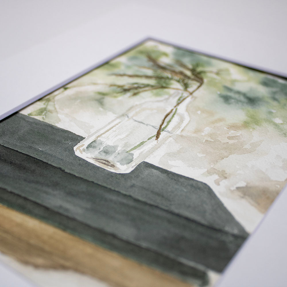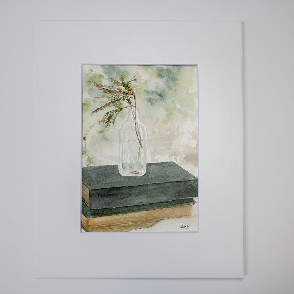 This watercolor art print captures the cozy essence of a little book stack and a small plant in vase. With muted, calming tones and wonderfully loose brushstrokes, it feels like a gentle daydream frozen in time. The blurred background keeps all the focus on your literary treasures and leafy friends. It's the perfect art print to tuck into any nook that needs a touch of whimsy and warmth. For readers, plant parents, and art lovers everywhere!