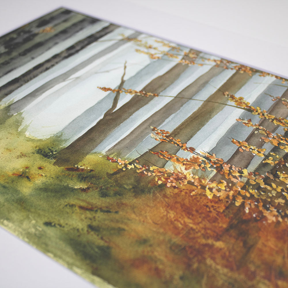 Bring the colors of fall inside with this beautiful landscape featuring trees, leaves, grasses in greens, oranges and soft blues. This painting uses texture and color to create a beautiful representation of a forest in fall with leaves and bushes.