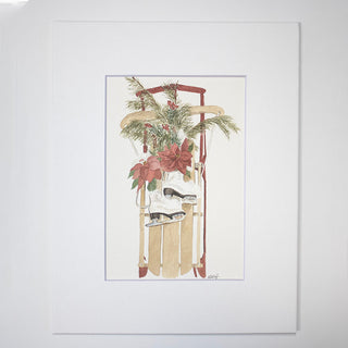 Holiday Sled with Ice Skates and Greenery, Hand-Painted Original Watercolor Painting, 5x7
