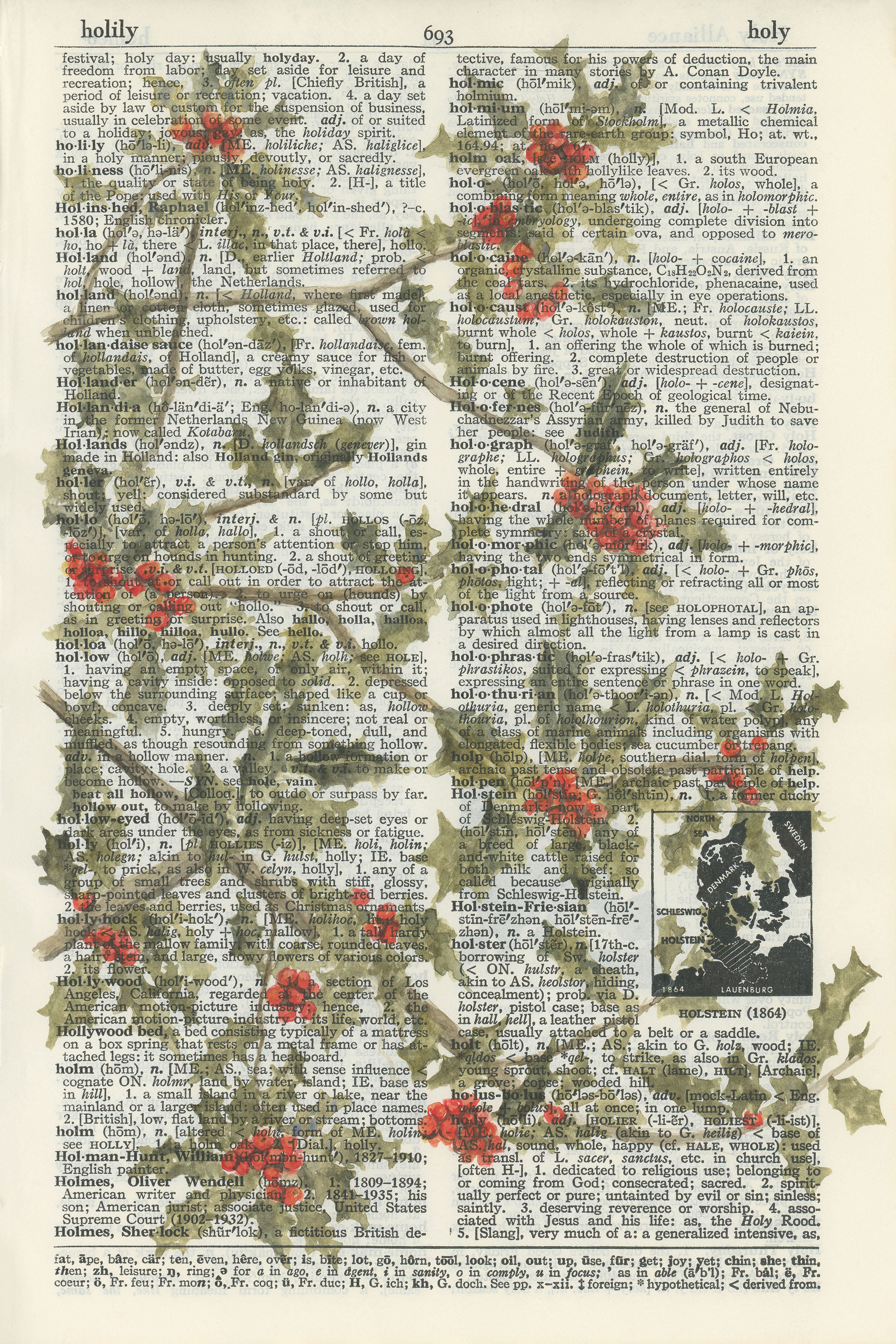 Holly on Dictionary Watercolor Art Print, Holiday Art