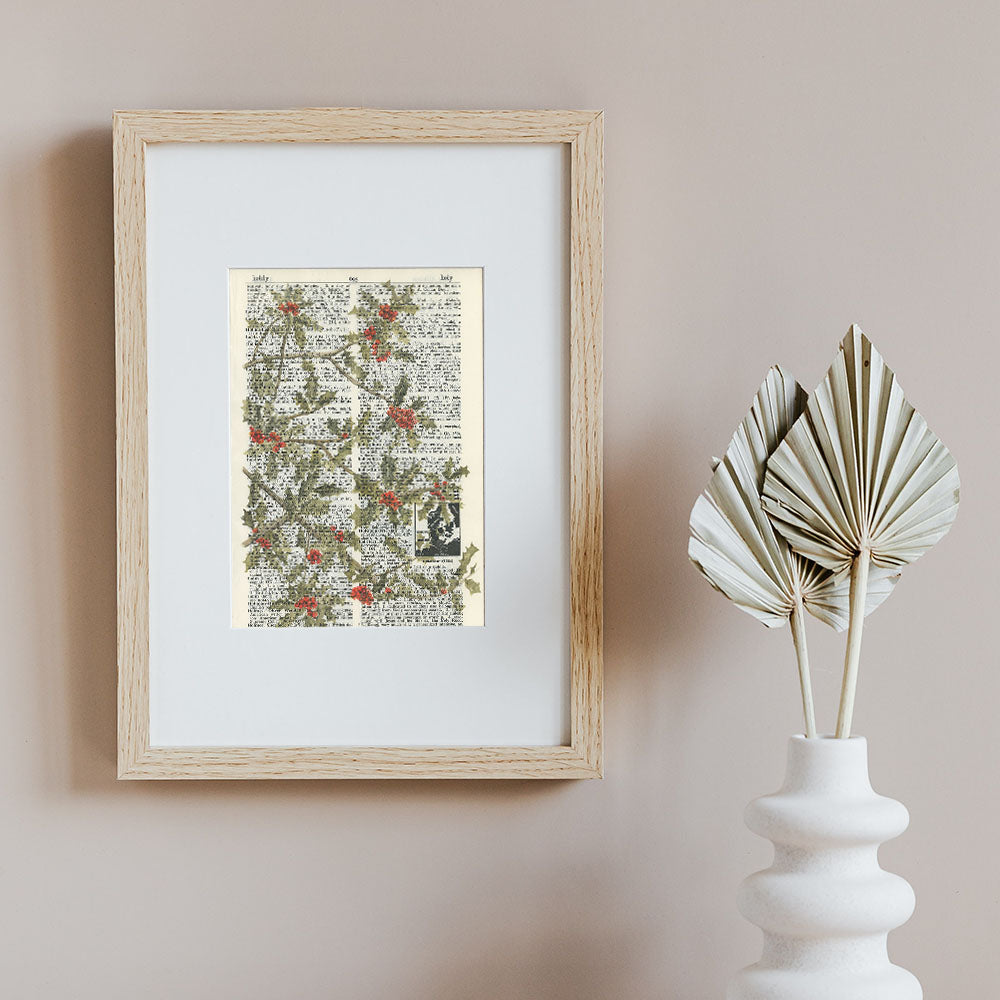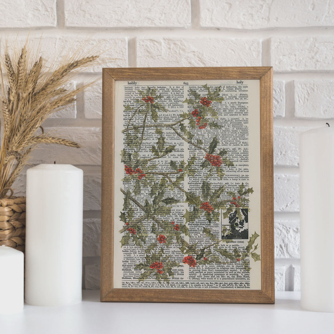 Bring a touch of literary charm to your holiday décor with this beautiful watercolor art print. Featuring holly leaves rendered in soft, muted tones, on a dictionary page background for a sophisticated, bookish aesthetic. Ideal for adding festive warmth to any room without overwhelming your neutral palette. A perfect gift for literature lovers and art enthusiasts alike.