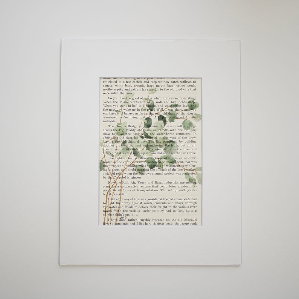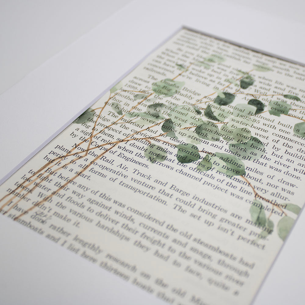 This artwork features delicate eucalyptus branches hand-painted in watercolor on a vintage book page. The result is a gentle, charming piece ideal for readers or anyone who appreciates distinctive art.