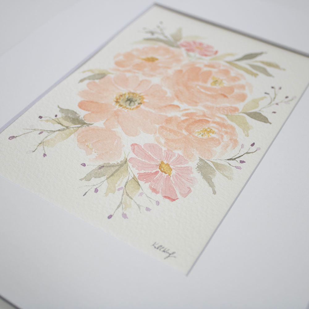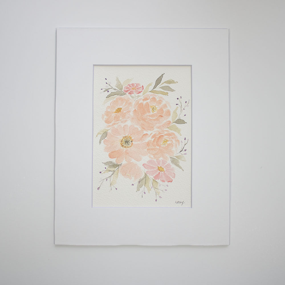 This 5x7 hand-painted watercolor features soft pink peonies and delicate leaves rendered in neutral tones. Its simple and elegant design brings a gentle, natural touch to any space, perfect for adding subtle floral charm without overwhelming your décor.